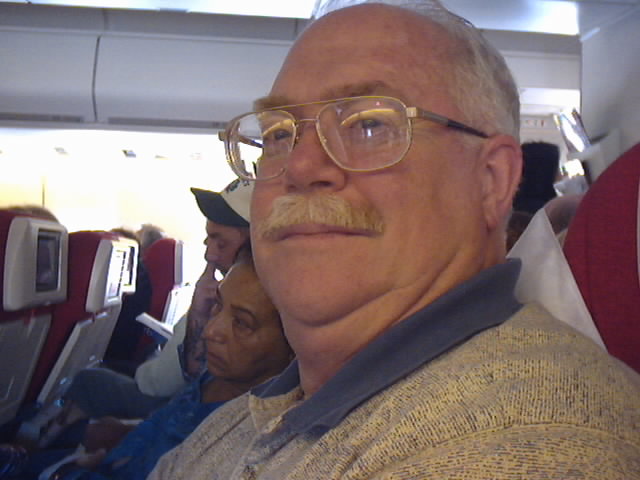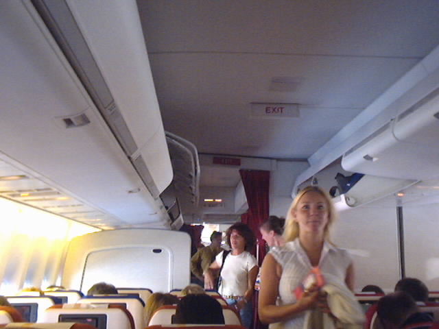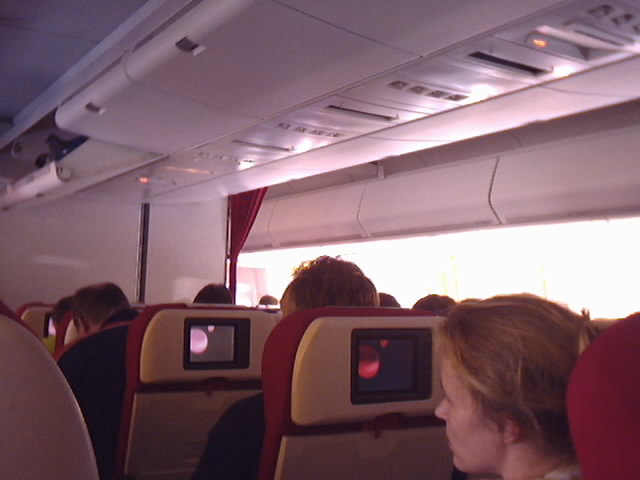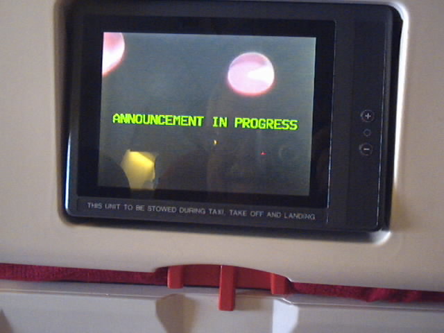 We finally board the Virgin Atlantic 747-400 and work our way down the aisles to get to our seats. The plane is a large "jumbo" jet but the interior still seems small. Even though the aisles are 10 seats across the beam at it's widest point. One nice feature on Virgin Atlantic is that every passenger has their own TV view screen directly in front of them.